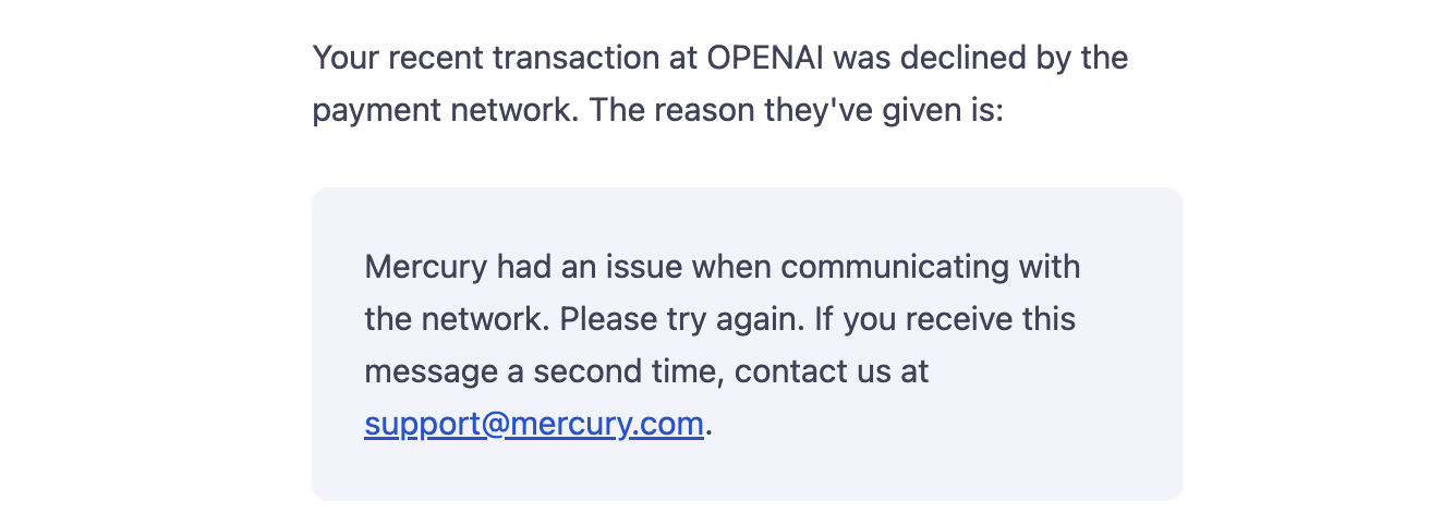I started looking through the list of external providers that the app relies on, trying to get a sense of how well they were holding up during the outage, and hoping to build my "just wait it out" case a little stronger. While I was doing that, he was attempting to top up an OpenAI account with more credits using a Mercury credit card. This mundane, totally unrelated activity of his finished the job for me. The transaction kept declining because, while OpenAI's site was up and their billing provider was up, Mercury's endpoint for authorizing transactions was down. It apparently relies on Cloudflare, so it was declining every attempted transaction as a reasonable (if annoying) fallback.